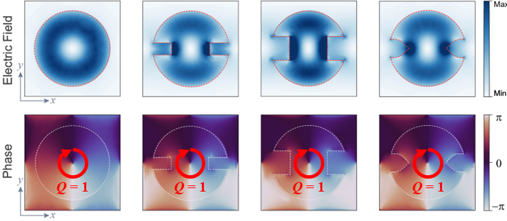 具有对结构微扰免疫的拓扑共振模式。其电场分布在结构中心呈现一个奇点,相位分布具有非平庸拓扑荷,不受结构微扰的影响